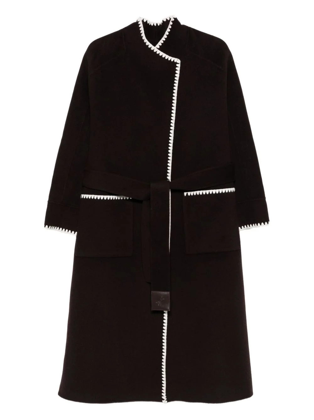scallop-trimmed belted coat Highlights - Dark brown - Scalloped trim - Belted waist - Side pockets - High neck - Self-tie belt - Long sleeves Imported Composition Acrylic 100%, Polyurethane 100%, Wool 78%, Polyamide 22% SIZE & FIT Model measurements Height 5 ft 11 in(1.8 m) Bust/Chest 31.49 in(80 cm) Hips 36.61 in(93 cm) Waist 24.4 in(62 cm) Washing instructions Dry Clean Only
