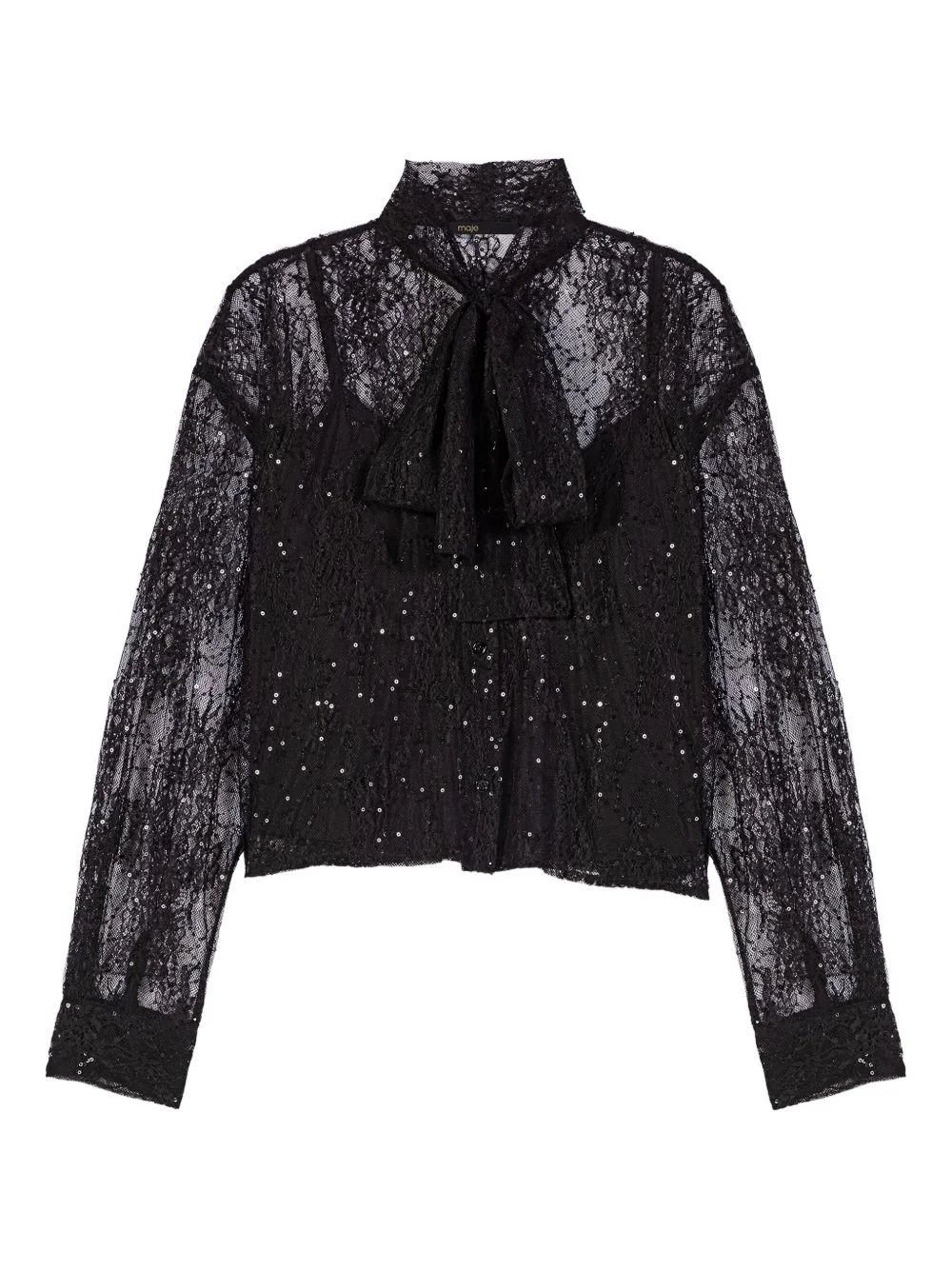 sequinned lace shirt Highlights - Black - Lace design - Sequin embellishment - Pussy-bow collar - Long sleeves - Button fastening Imported Composition Outer: Recycled Polyamide 50%, Polyamide 50% Lining: Polyester 100%, Elastane 100% Washing instructions Hand Wash