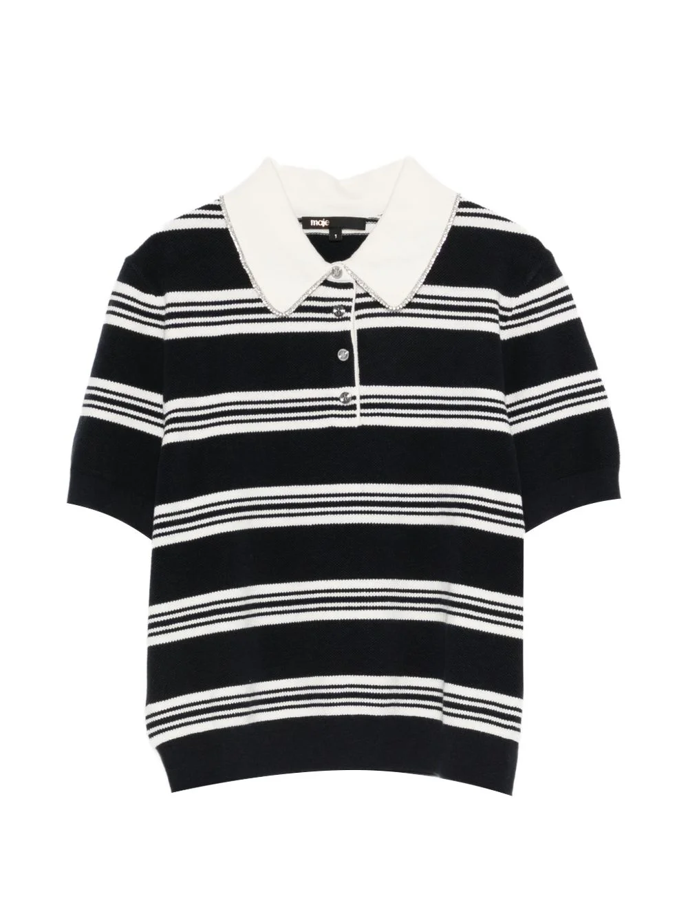 striped polo top Highlights - White/navy blue - Striped - Button fastening - Short sleeves Imported Composition Organic Cotton 90%, Silk 10% Washing instructions Hand Wash