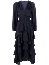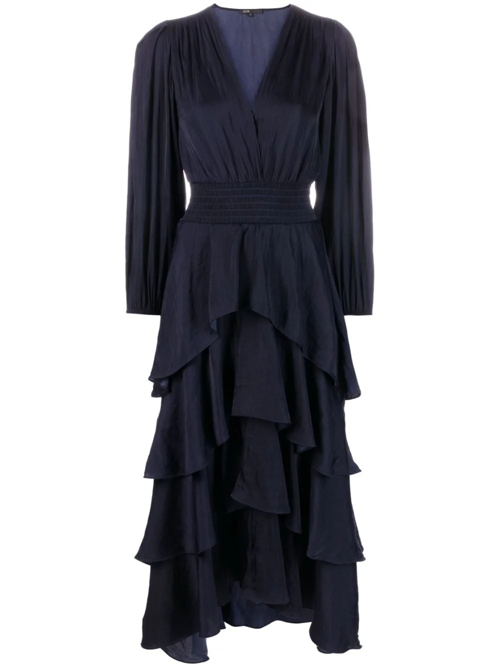 ruffled maxi dress Maje's expertise in proportion and fabric manipulation is captured in this midi dress. Imagined in navy blue, it's characterised by gathered detailing and a tiered skirt, that lend the piece texture and dimension. Highlights - Navy blue - V-neck - Shirred panel - Long sleeves - Tiered skirt - Asymmetric hem - Mid-length Imported Composition Polyester 100% SIZE & FIT Model measurements Height 5 ft 10 in(1.78 m) Bust/Chest 30.7 in(78 cm) Hips 34.64 in(88 cm) Waist 23.22 in(59 cm) Washing instructions Hand Wash