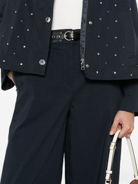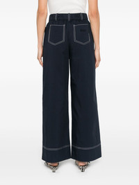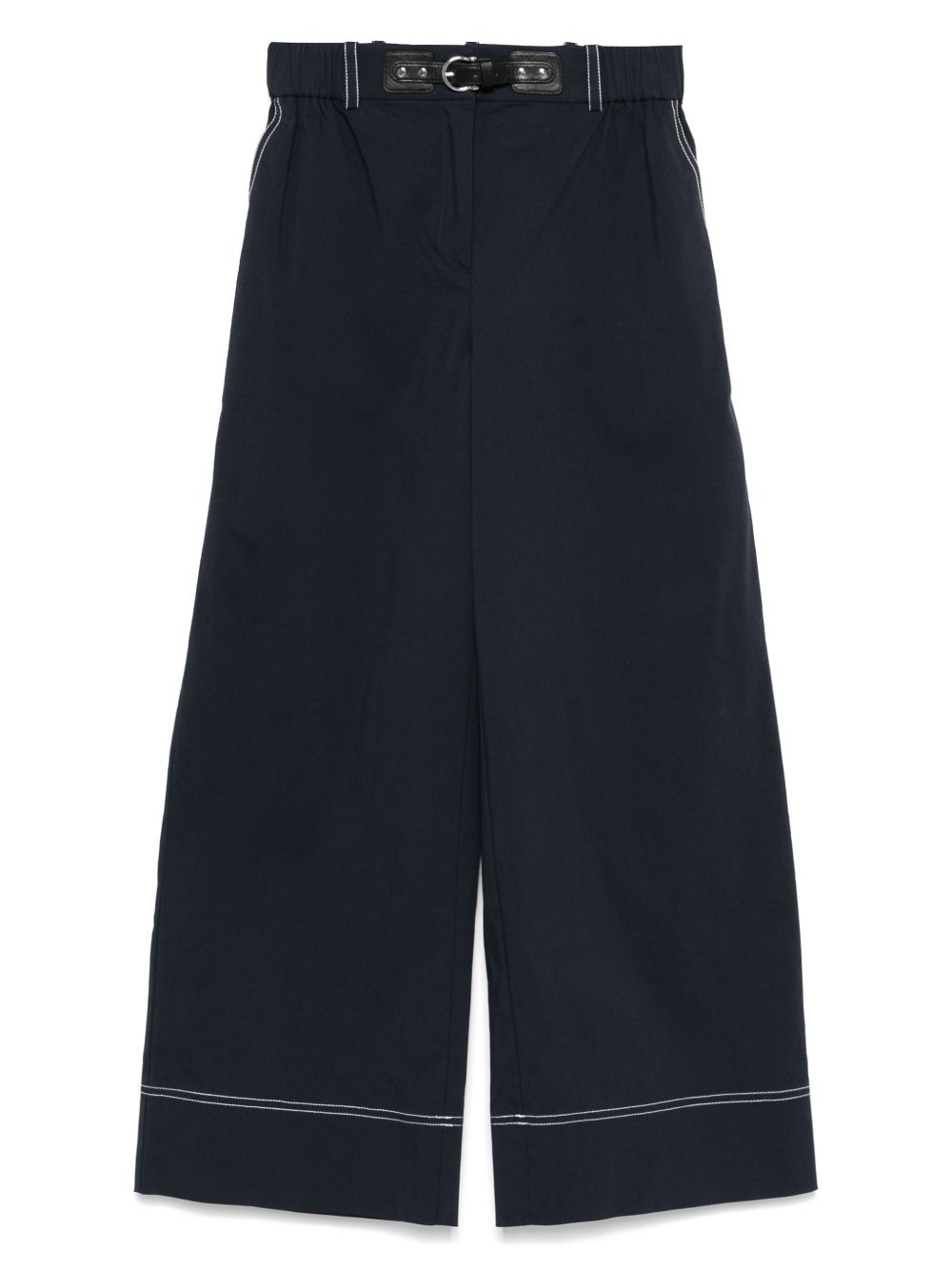 wide-leg trousers Highlights - Navy blue - Buckle fastening - Elasticated waistband - Front zip fastening - Belt loops - Two rear patch pockets Imported Composition Cotton 69%, Nylon 28%, Spandex/Elastane 3% SIZE & FIT Model measurements Height 5 ft 9 in(1.75 m) Bust/Chest 32.67 in(83 cm) Hips 36.22 in(92 cm) Waist 24.8 in(63 cm) FittingInformation Designed with a wide-leg cut, these trousers allow for a close fit at the waist and offer a loose and roomy fit over the leg The elasticated waist allows for a comfortable fit Made from a midweight stretch fabric, this piece offers elasticity and flexibility when worn Washing instructions Machine Wash