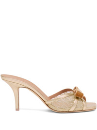 70mm Perla velvet-bow sandals Highlights - Gold - Glitter mesh - Velvet bow - Open toe - Slip-on style Made in Italy Composition Outer: Mesh 100%, Nappa Leather 100%, Velvet 100% Lining: Calf Leather 100% Sole: Calf Leather 100% SIZE & FIT Measurement HEEL 2.75 in(7 cm)