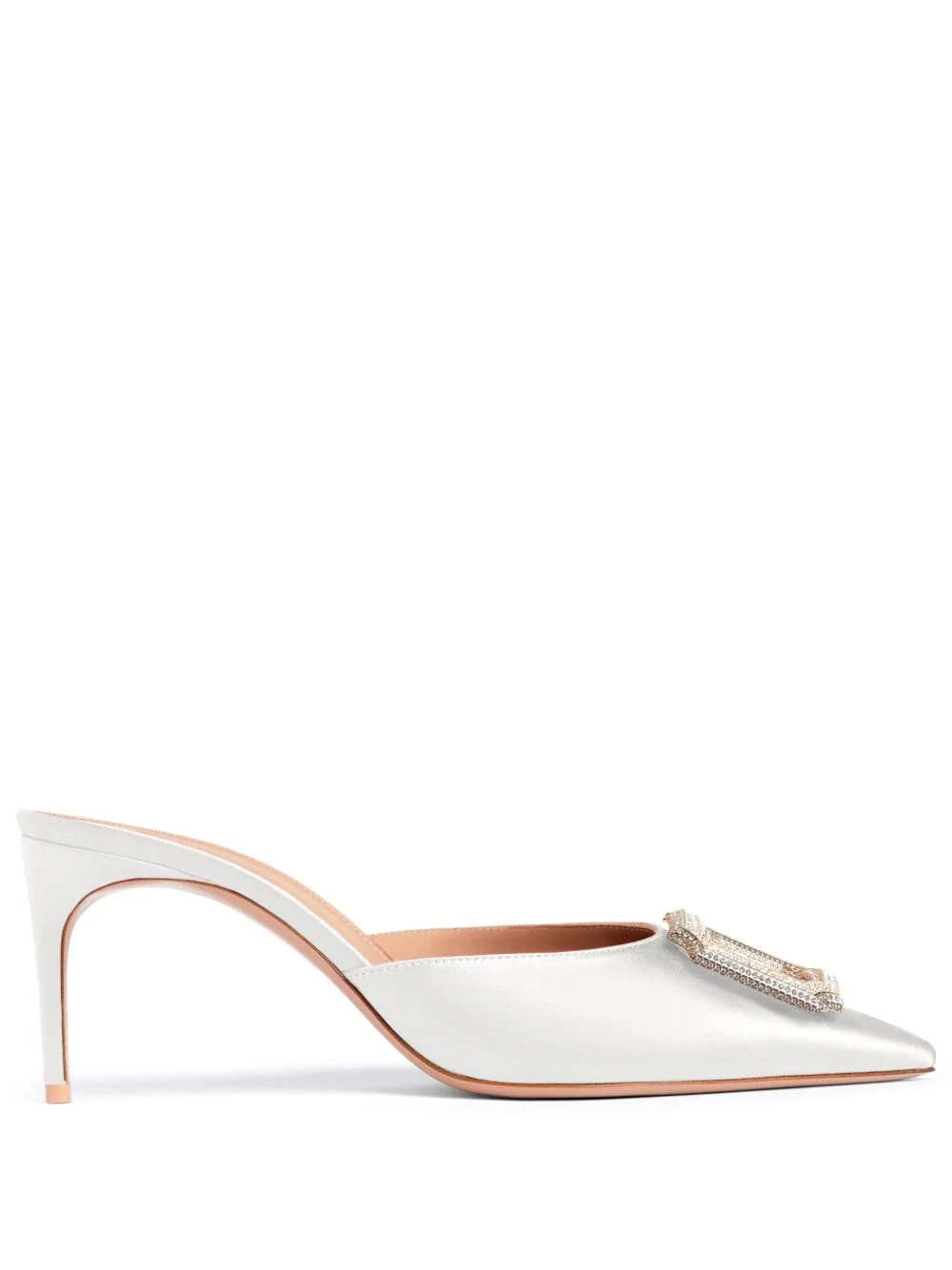 Mona 70mm leather mules Highlights - Optical white - Leather - Crystal embellishment - Pointed toe - Branded leather insole - 70mm mid heel - Slip-on style Made in Italy Composition Outer: Satin 100% Sole: Leather 100% Lining: Leather 100%
