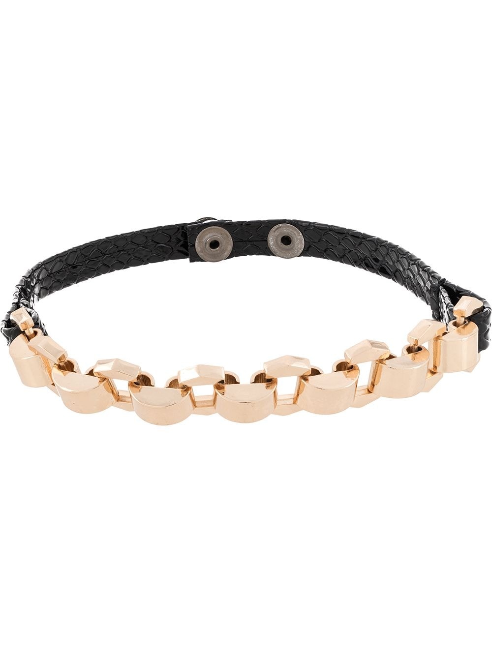 Fab leather choker Highlights - Black/gold-tone - Leather/brass - Embossed crocodile effect - Press-stud fastening Imported SIZE & FIT Model measurements Height 5 ft 10 in(1.78 m) Bust/Chest 31.49 in(80 cm) Hips 36.22 in(92 cm) Waist 25.59 in(65 cm) Measurement Length when open 14.17 in(36 cm) WIDTH 0.78 in(2 cm)