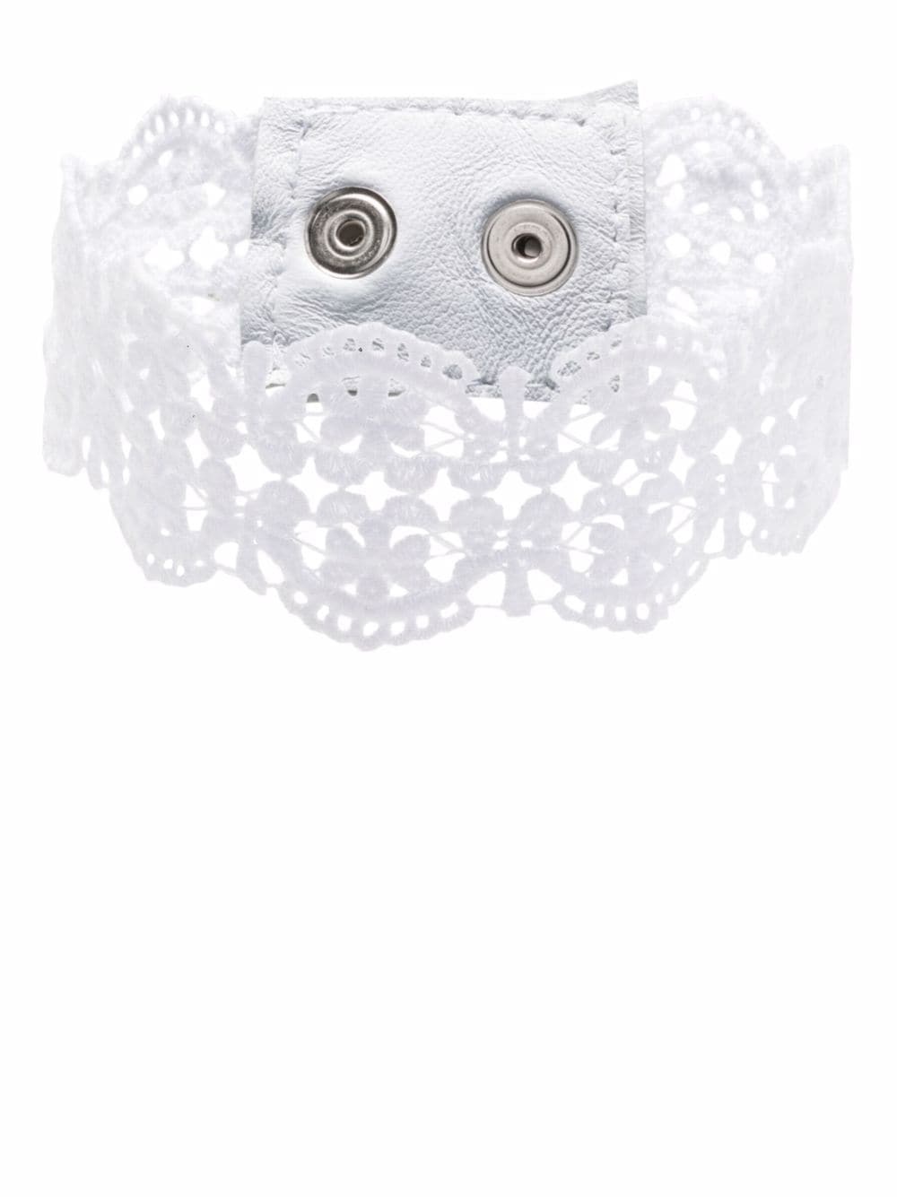 Katherine lace choker necklace white leather floral-lace detailing rear press-stud fastening adjustable fit Imported SIZE & FIT Model measurements Height 5 ft 10 in(1.78 m) Bust/Chest 33.07 in(84 cm) Hips 36.61 in(93 cm) Waist 24.8 in(63 cm) Measurement Length when open 12.99 in(33 cm) WIDTH 1.37 in(3.5 cm)