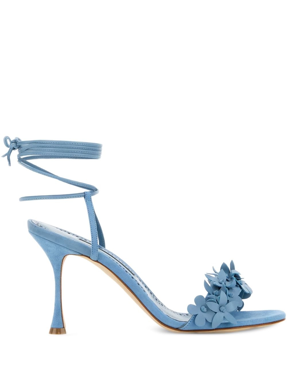 90mm flower-embellished lace-up heeled sandals Highlights - Light blue - Leather upper - Leather sole - Lace-up ankle fastening - Flower-embellishment Made in Italy Composition Outer: Calf Suede 100%, Calf Leather 100% Lining: Calf Leather 100%, Calf Suede 100% Sole: Calf Leather 100%, Rubber 100% SIZE & FIT Measurement HEEL 3.54 in(9 cm)