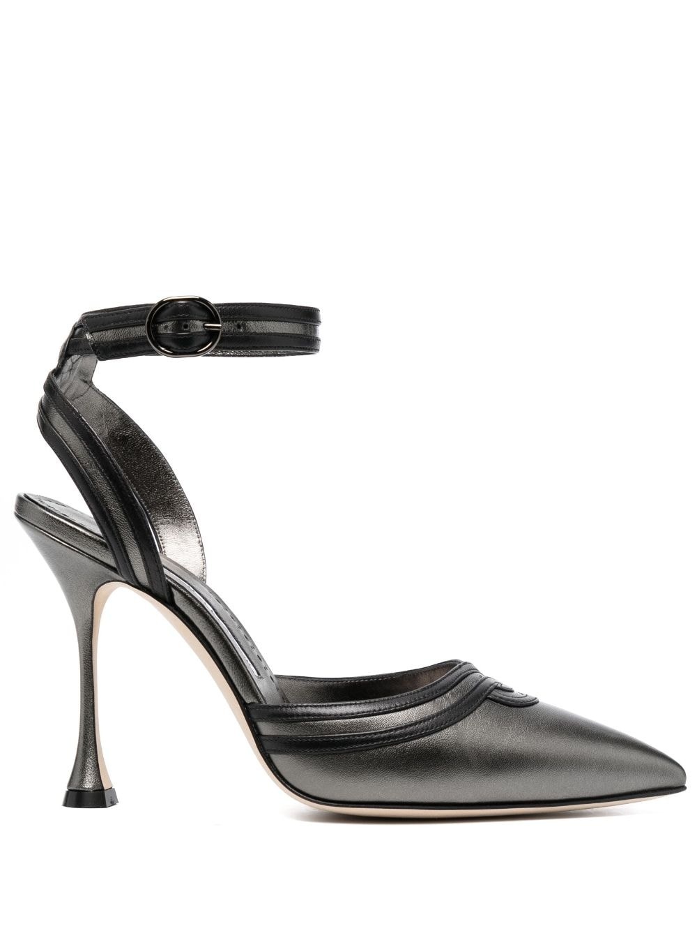 Chonga 105mm leather pumps Highlights - Black/grey - Calf leather - Metallic sheen - Contrasting trim - Pointed toe - Buckle-fastening ankle strap - Branded leather insole - High stiletto heel Made in Italy Composition Lining: Calf Leather 100% Outer: Calf Leather 100% Sole: Calf Leather 100% SIZE & FIT Measurement CIRCUMFERENCE 8.66 in(22 cm) HEEL 4.13 in(10.5 cm) HEIGHT 3.14 in(8 cm)