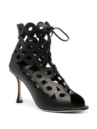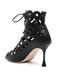 Taralo 90mm cut-out boots Manolo Blahnik turns to European architecture for inspiration in the Tatalo boots. Crafted from calf leather by skilled artisans in the brand's Italian factories, they boast intricate cut-outs in a figure-eight pattern to 'reflect the ornate mosaics and extravagant baroque decoration of Andalusia'. Highlights - Black - Calf leather - Cut-out detailing - Peep toe - Front lace-up fastening - 90mm stiletto heel - Branded leather insole - Leather outsole Made in Italy Composition Lining: Calf Leather 100% Outer: Calf Leather 100% Sole: Calf Leather 100% SIZE & FIT Measurement CIRCUMFERENCE 7.87 in(20 cm) HEEL 3.34 in(8.5 cm) HEIGHT 3.93 in(10 cm)