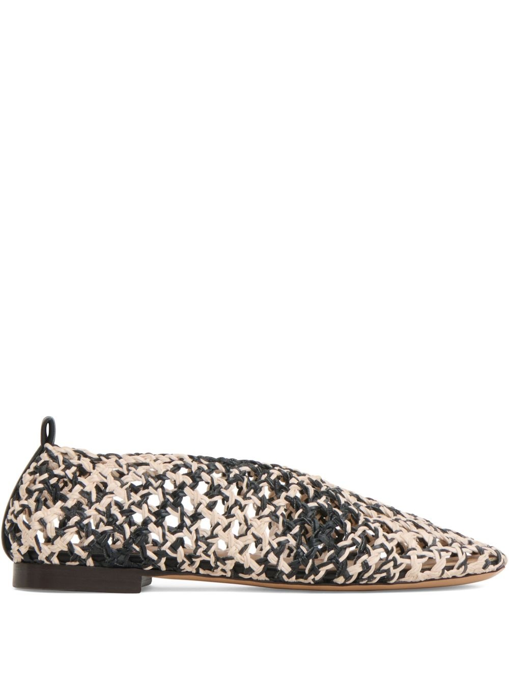 leather ballet flats Highlights - Black and beige - Intricate woven design - Round toe - Slip-on style - Flat heel Imported Composition Outer: Polyurethane 100% Lining: Calf Leather 100% Sole: Calf Leather 100%