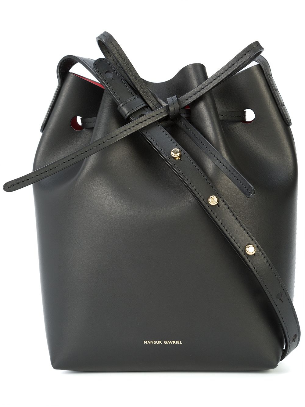 Mini Bucket bag Highlights - Black leather mini bucket bag from mansur gavriel featuring an adjustable shoulder strap, a drawstring fastening, a front centre logo stamp and a main internal compartment. Made in Italy Composition Outer: Calf Leather 100% SIZE & FIT Model measurements Height 5 ft 11 in(1.8 m) Bust/Chest 31.49 in(80 cm) Hips 36.61 in(93 cm) Waist 24.4 in(62 cm) Measurement WIDTH 7.08 in(18 cm) HEIGHT 9.84 in(25 cm) DEPTH 4.72 in(12 cm) STRAP 22.04 in(56 cm)