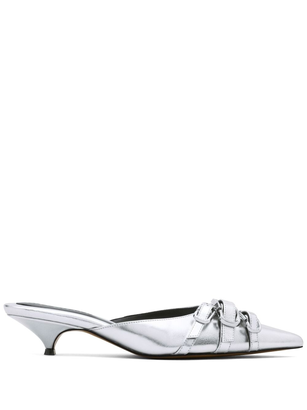 35mm The Emma Kitten mules Highlights - Silver-tone - Calf leather - Metallic effect - 35mm low kitten heel - Decorative buckle detailing - Pointed toe - Branded leather insole - Leather sole Imported Composition Outer: Calf Leather 100% Lining: Calf Leather 100% Sole: Calf Leather 100% SIZE & FIT Measurement HEEL 1.37 in(3.5 cm)