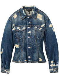 distressed denim jacket Highlights - Blue - Cotton - Denim - Dark wash - Distressed effect - Ripped detailing - Silver-tone logo plaque - Classic collar - Front button fastening - Fitted waistline - Two chest flap pockets - Long sleeves - Buttoned cuffs - Straight hem Imported Composition Cotton 100%