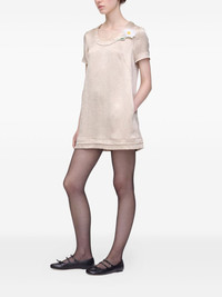 flower-embellished dress Highlights - Beige - Crushed satin texture - Short sleeves - Flower applique - Straight hemline Imported Composition Acetate 100% Washing instructions Dry Clean Only