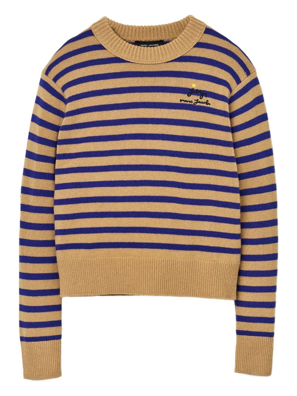 striped flower-embellished sweater Highlights - Camel - Blue stripes - Embroidered lettering - Flower elbow patches - Crew neck - Long sleeves Imported Composition Wool 90%, Cashmere 10%