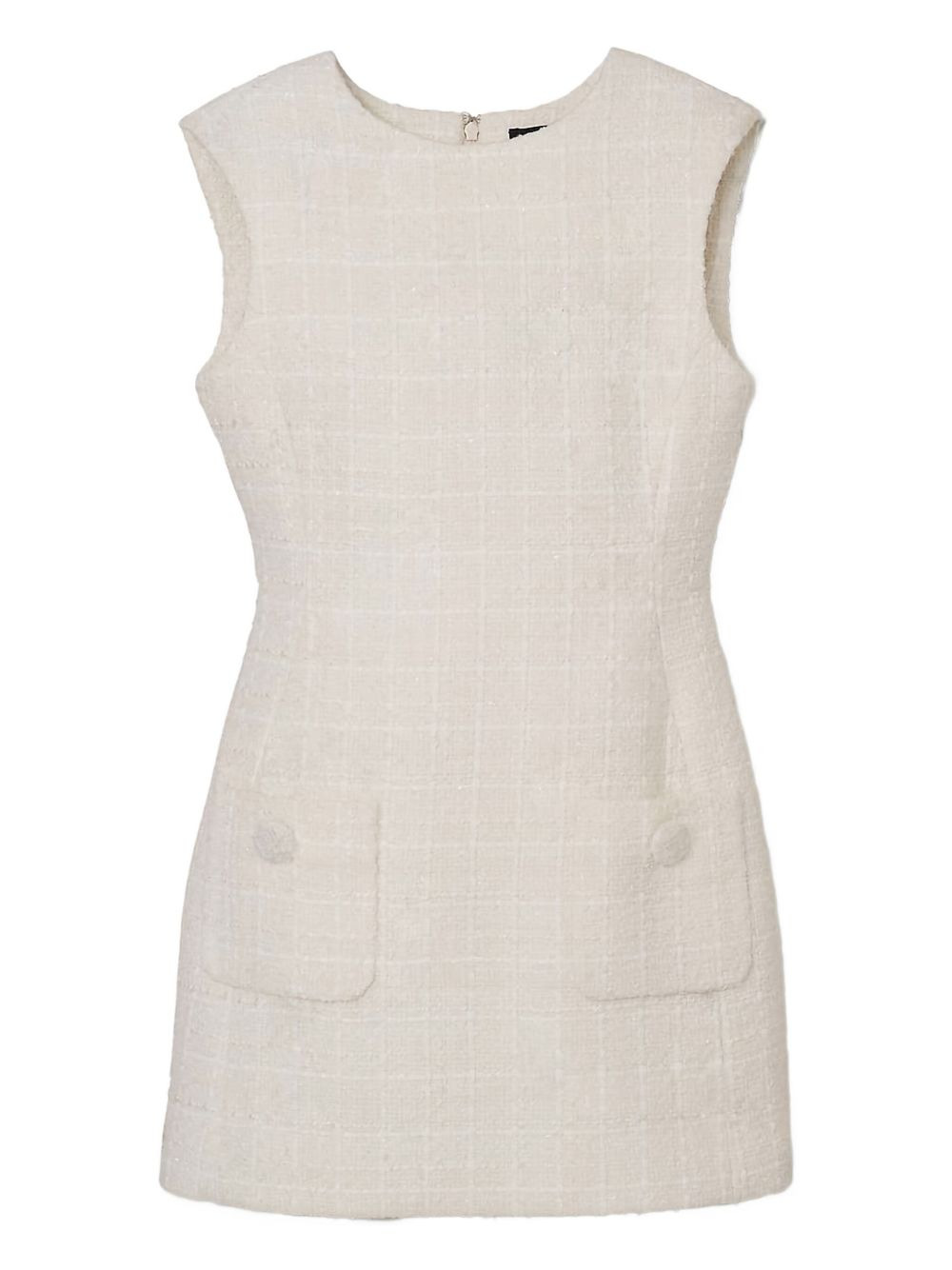 tweed pocket mini dress Highlights - Ivory - Tweed texture - Sleeveless - Round neck - Patch pockets - Button embellishments Imported Composition Acrylic 38%, Polyester 25%, Cotton 25%, Viscose 12%