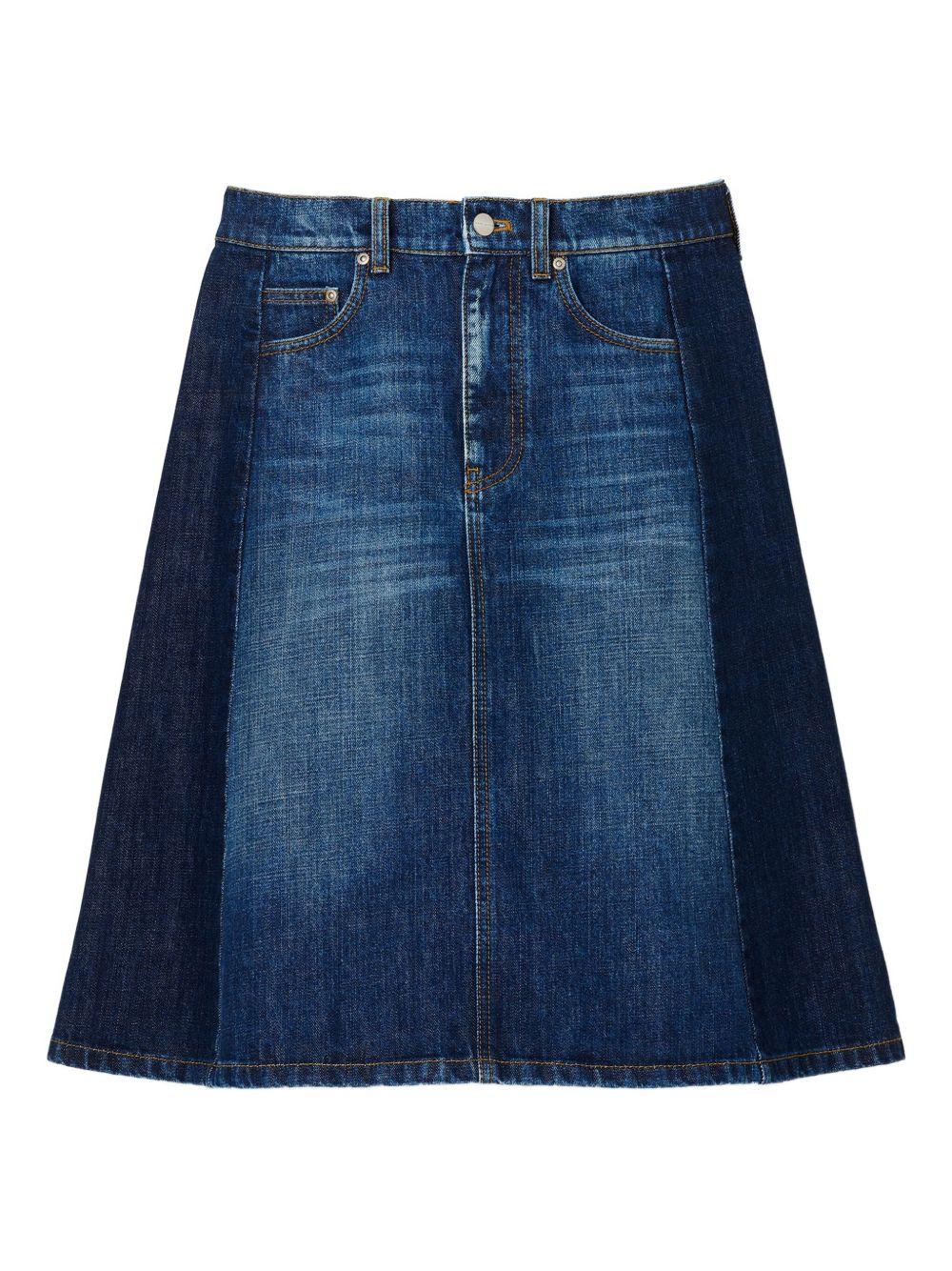 two-tone denim skirt Highlights - Dark blue - A-line shape - Two-tone denim - Button fastening - Contrasting stitching - Back patch pocket Imported Composition Cotton 100% Washing instructions Hand Wash