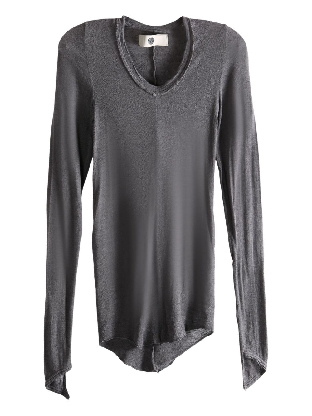 long-sleeve top Highlights - Dark grey - Crew neck - Long sleeves - Thumb holes - Raw hem Made in France Composition Viscose 75%, Wool 19%, Elastane 6% Washing instructions Read Manufacturer Guidelines