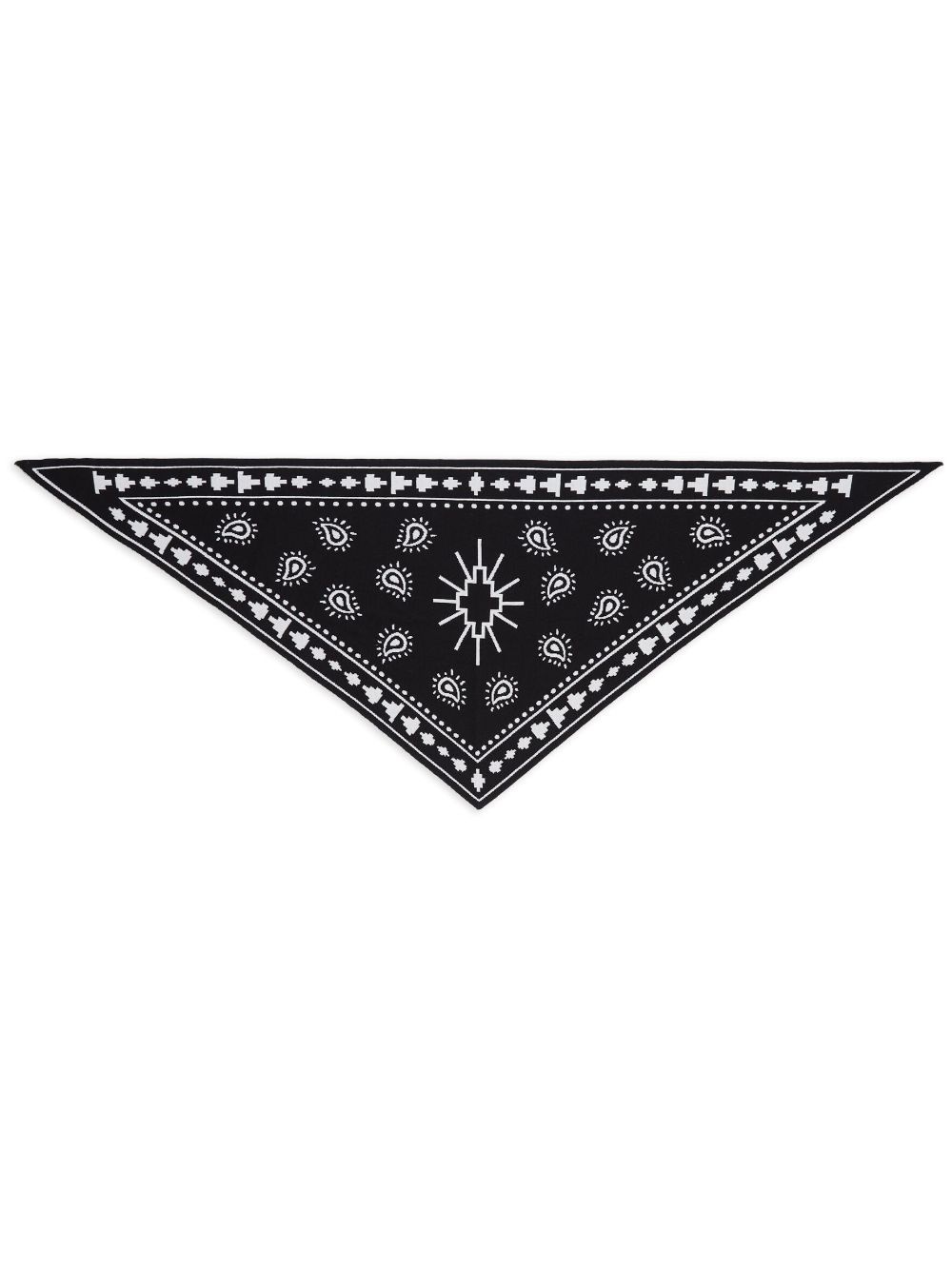 Bandana knitted scarf Popular in the rock culture from the '80s, bandanas were a hair and wrist accessory. Twenty years later, the '00s arrive and the bandanas are reinvented, then used as functional cropped tops. In this 2023 iteration from Marcelo Burlon County of Milan, they take back their meaning, interpreted as neck scarves, here spun from a wool blend knit in black and white hues. Highlights - Black/white - Wool blend - Fine knit - Bandana print - Triangle shape Made in Italy Composition Acrylic 50%, Wool 50%