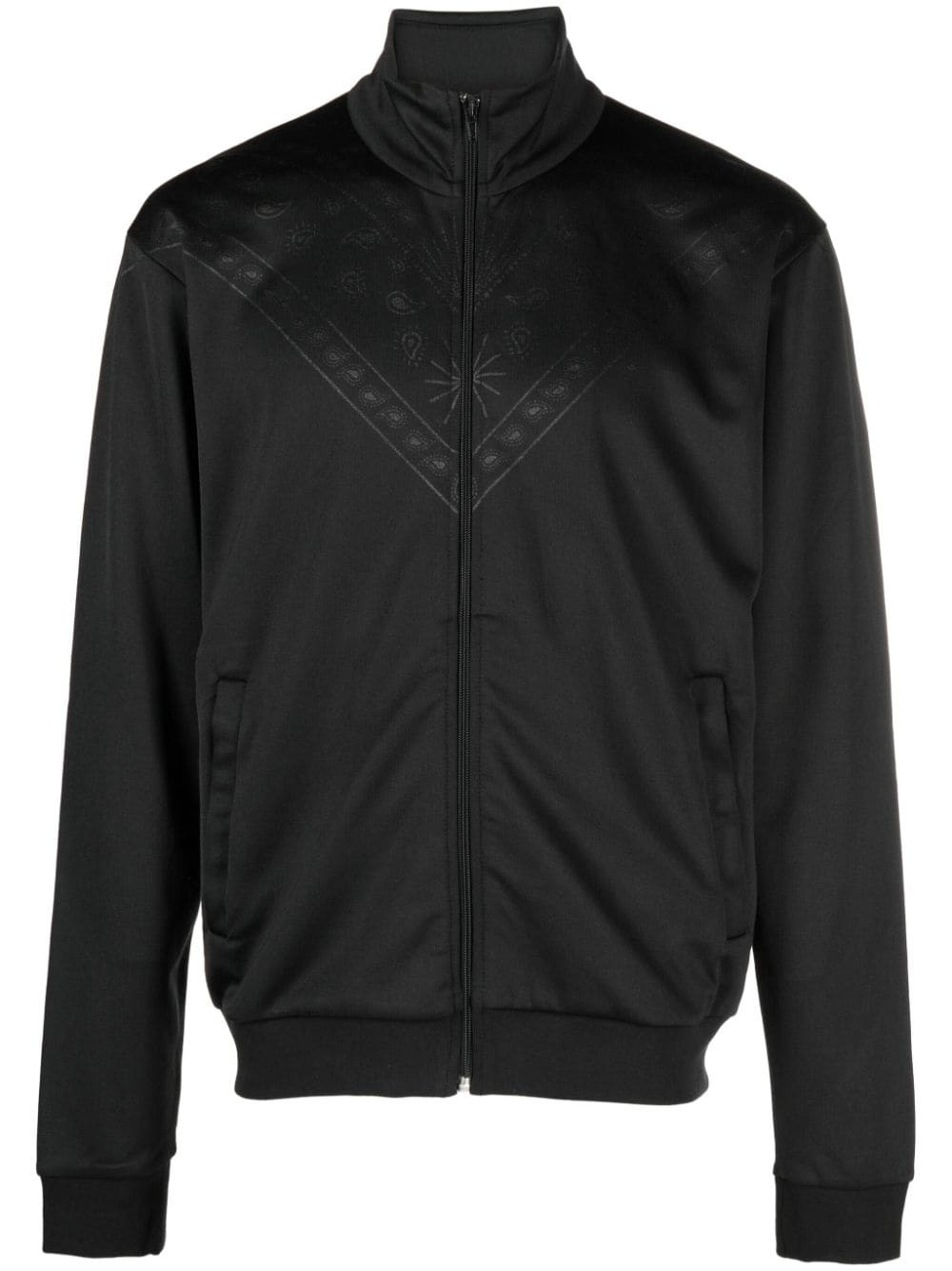bandana-print track jacket This track jacket from Marcelo Burlon County of Milan is subtly decorated with a tonal bandana print. It features a zip closure for practicality. Highlights - Black - Bandana print - High neck - Front zip fastening - Long sleeves - Two side slash pockets - Straight hem Imported Composition Polyester 52%, Cotton 48% SIZE & FIT Model measurements Height 6 ft 2 in(1.89 m) Bust/Chest 38.97 in(99 cm) Hips 38.18 in(97 cm) Waist 32.28 in(82 cm) FittingInformation Designed for a relaxed fit, this piece allows for comfort and movement when worn Made from a midweight non-stretch fabric, this piece offers minimal elasticity when worn This piece fits true to size – take your usual size Washing instructions Machine Wash
