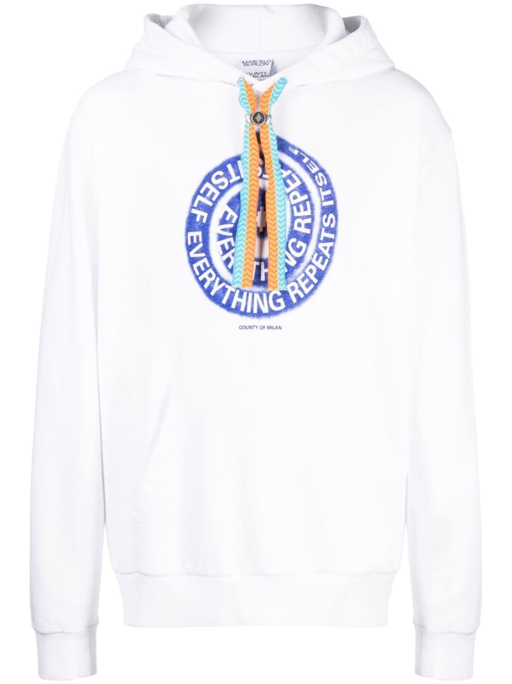 swirl-print cotton hoodie Taking inspiration from ‘90s club culture, Marcelo Burlon County of Milan presents a bold swirl print at the centre of this cotton hoodie, showcasing the brand's penchant for graphic embellishments. Highlights - Blue/white - Cotton - Swirl print - Text print - Drawstring hood - Long sleeves - Front pouch pocket - Straight hem Imported Composition Cotton 100% SIZE & FIT Model measurements Height 6 ft 2 in(1.87 m) Bust/Chest 34.25 in(87 cm) Hips 36.22 in(92 cm) Waist 29.52 in(75 cm) FittingInformation Designed to be unstructured, offering a loose fit throughout Made from a midweight non-stretch fabric, this piece offers minimal elasticity when worn This piece fits true to size – take your usual size