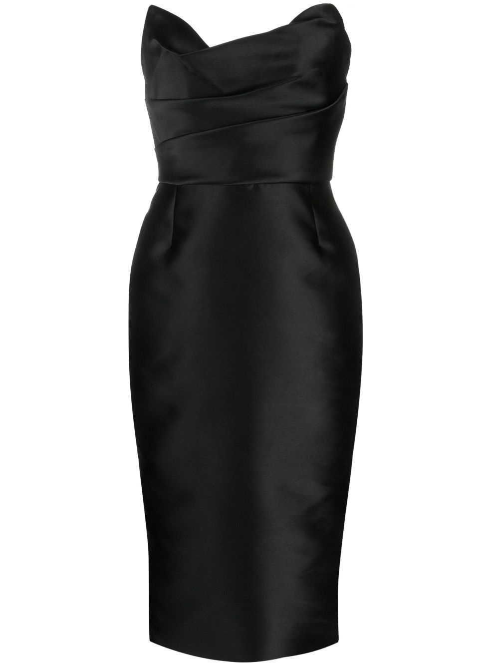 strapless satin midi dress Highlights - Black - Satin finish - Draped detailing - Concealed rear zip fastening - Below-knee length Made in United States Composition Outer: Nylon 78%, Polyester 70%, Silk 30%, Spandex/Elastane 22% Lining: Polyester 100% SIZE & FIT Model measurements Height 5 ft 10 in(1.77 m) Bust/Chest 32.67 in(83 cm) Hips 35.43 in(90 cm) Waist 23.62 in(60 cm)