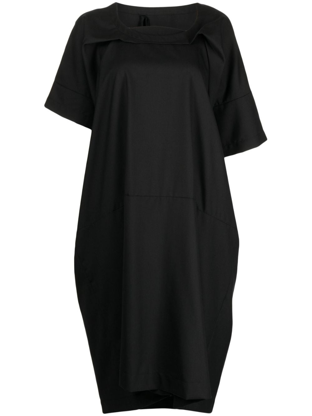 asymmetric midi wool dress Highlights - Black - Wool - Square neck - Layered details - Short sleeves - Drop shoulder - Asymmetric hem Imported Composition Wool 100% SIZE & FIT Model measurements Height 5 ft 9 in(1.76 m) Bust/Chest 31.1 in(79 cm) Hips 35.03 in(89 cm) Waist 24.4 in(62 cm) FittingInformation Designed to be unstructured, offering a loose fit throughout Made from a midweight non-stretch fabric This piece fits true to size – take your usual size