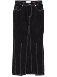 Crescent-Moon maxi skirt Highlights - Black - Organic cotton - Denim - Panelled design - Crescent moon print - Front button and zip fastening - Belt loops - Contrast stitching - Classic five pockets - Logo patch to the rear - Crescent moon embroidery - Rear slit - Asymmetric hem - Long length Made In Italy Composition Lining: Organic Cotton 100% Outer: Organic Cotton 100%