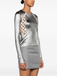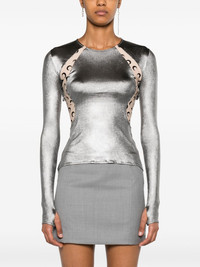 Crescent Moon-panelled jersey top Crafted from silver jersey to a second-skin silhouette, Marine Serre’s top is characterised by its metallic finish. It’s punctuated with Crescent Moon-print panels, evoking the brand’s focus on hybridity and transformation. Highlights - Silver - Jersey texture - Metallic finish - Crescent moon print - Tonal stitching - Draped detailing - Round neck - Self-tie fastening - Long sleeves - Ribbed cuffs and hem - Rear curved hem Imported Composition Polyester 100% SIZE & FIT Model measurements Height 5 ft 10 in(1.77 m) Bust/Chest 33.07 in(84 cm) Hips 37 in(94 cm) Waist 24.8 in(63 cm) FittingInformation Designed for a close fit throughout Made from a lightweight non-stretch fabric, this piece offers minimal elasticity when worn This piece fits true to size – take your usual size