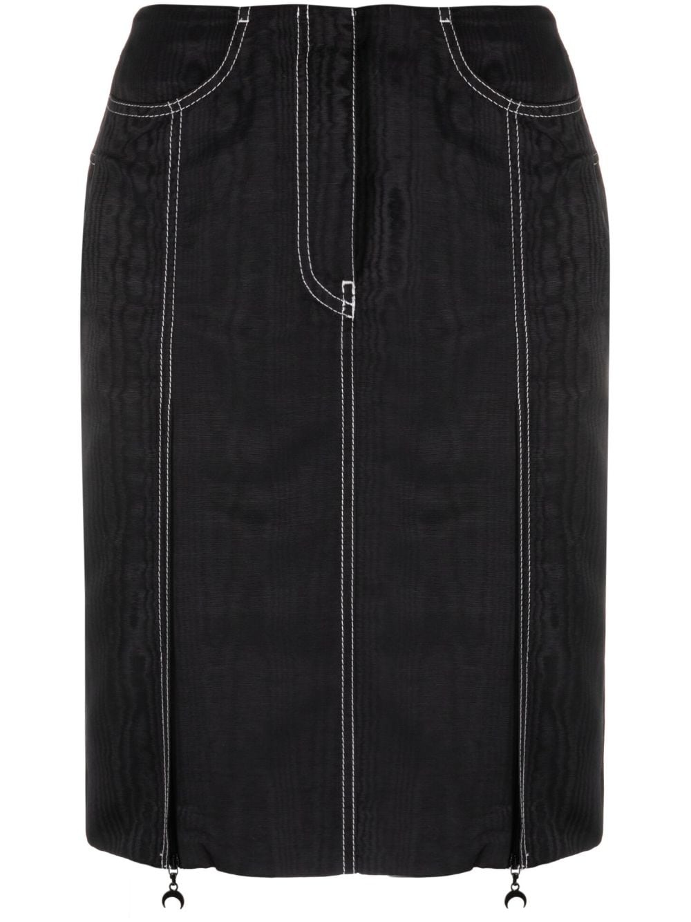 crescent-moon pendant skirt Boasting contrasting stitching details throughout, this Marine Serre skirt is rendered in a dark black colour. Two zips with the ever-present crescent moon motif allow to open two slits at the front. Highlights - Black - Contrast stitching - Logo patch to the rear - Crescent moon pendant - Front zip fastening - Front slit - Two front pouch pockets - Above-knee length Imported Composition Outer: Polyester 100% Lining: Viscose 58%, Cupro 42% SIZE & FIT Model measurements Height 5 ft 10 in(1.78 m) Bust/Chest 29.92 in(76 cm) Hips 34.64 in(88 cm) Waist 23.62 in(60 cm) FittingInformation This midi-length skirt is intended to be worn just below the waist Made from a midweight non-stretch fabric This piece fits true to size – take your usual size Washing instructions Hand Wash