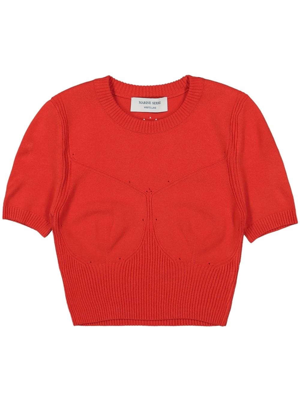 cropped knitted top Highlights - Bright red - Knitted construction - Perforated detailing - Siganture crescent moon motif - Crew neck - Short sleeves - Ribbed cuffs and hem - Cropped Imported Composition Viscose 98%, Spandex/Elastane 2%