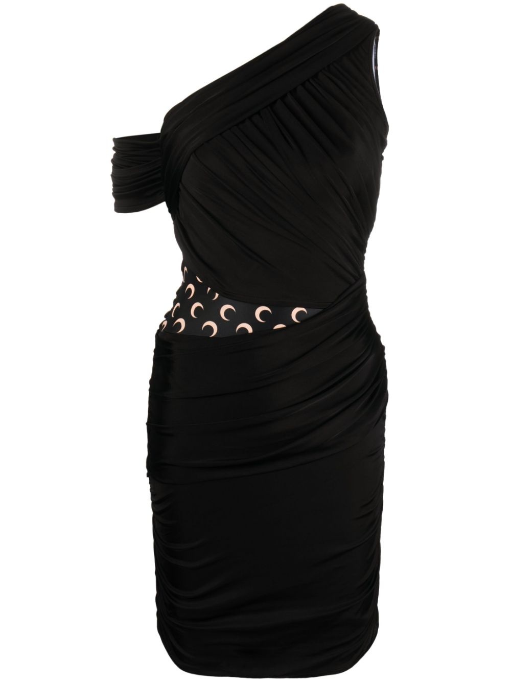 draped one-shoulder dress Marine Serre's iconic Moon Diamant pattern takes the focus of this black mini dress. The signature detail appears on the side panel, contrasting with the rest of its all-black design. Highlights - Black - Stretch-design - Signature moonogram pattern - Draped design - One-shoulder Imported Composition Viscose 95%, Elastane 5% SIZE & FIT Model measurements Height 5 ft 10 in(1.78 m) Bust/Chest 31.49 in(80 cm) Hips 35.03 in(89 cm) Waist 23.62 in(60 cm) Measurement HIPS 31.49 in(80 cm) LENGTH 34.25 in(87 cm) WAIST 22.04 in(56 cm) FittingInformation Designed for a slim fit that sits just away from the body offering a close yet comfortable fit Made from a midweight stretch fabric, this piece offers elasticity and flexibility when worn This piece fits true to size – take your usual size