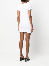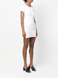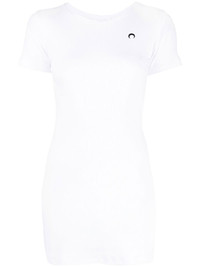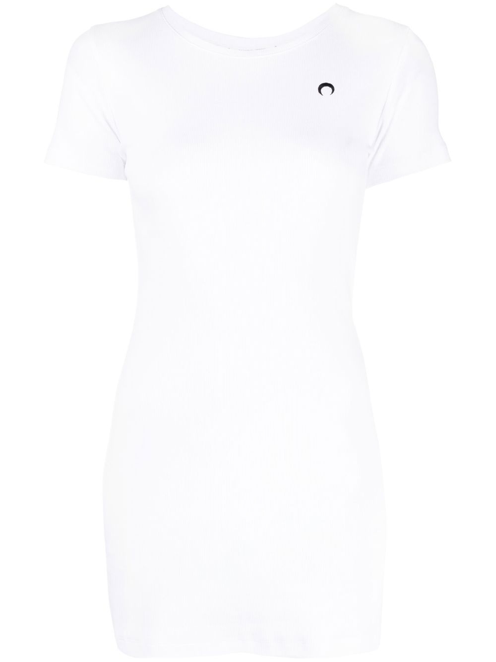 fine-ribbed organic cotton T-shirt dress The vertical ribbing on this Marine Serre dress accentuates its figure-hugging silhouette, lending an elegant style to the T-shirt design. The brand's signature half-moon motif appears embroidered on the chest. Highlights - White - Organic cotton - Fine ribbed - Crew neck - Short sleeves - Embroidered logo at the chest - Straight hem Imported Composition Organic Cotton 100% SIZE & FIT Model measurements Height 5 ft 11 in(1.8 m) Bust/Chest 31.49 in(80 cm) Hips 35.82 in(91 cm) Waist 24.8 in(63 cm) FittingInformation This piece fits true to size. We recommend you get your regular size Cut for a slim fit Made with a mid-weight fabric Washing instructions Dry Clean Only
