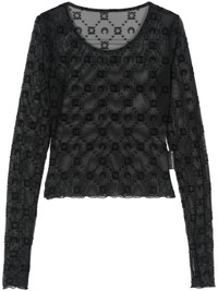 flocked-monogram crop top Highlights - Black - Recycled polyamide blend - Sheer coverage - Mesh design - Flocked monogram jacquard - Mini logo tag - Round neck - Long sleeves - Straight hem - Cropped Made in France Composition Recycled Polyamide 86%, Polyamide 72%, Cotton 28%, Elastane 14% SIZE & FIT Model measurements Height 5 ft 10 in(1.77 m) Bust/Chest 33.85 in(86 cm) Hips 37 in(94 cm) Waist 26.37 in(67 cm) Measurement SLEEVE LENGTH 25.19 in(64 cm) LENGTH 17.32 in(44 cm) BUST 30.7 in(78 cm) Shoulder Width 12.59 in(32 cm) FittingInformation Designed for a close fit throughout The sleeves are constructed with additional length and built-in thumb loops that allow for movement and a secure fit Made from a lightweight stretch fabric, this piece offers elasticity and flexibility when worn This piece fits true to size – take your usual size