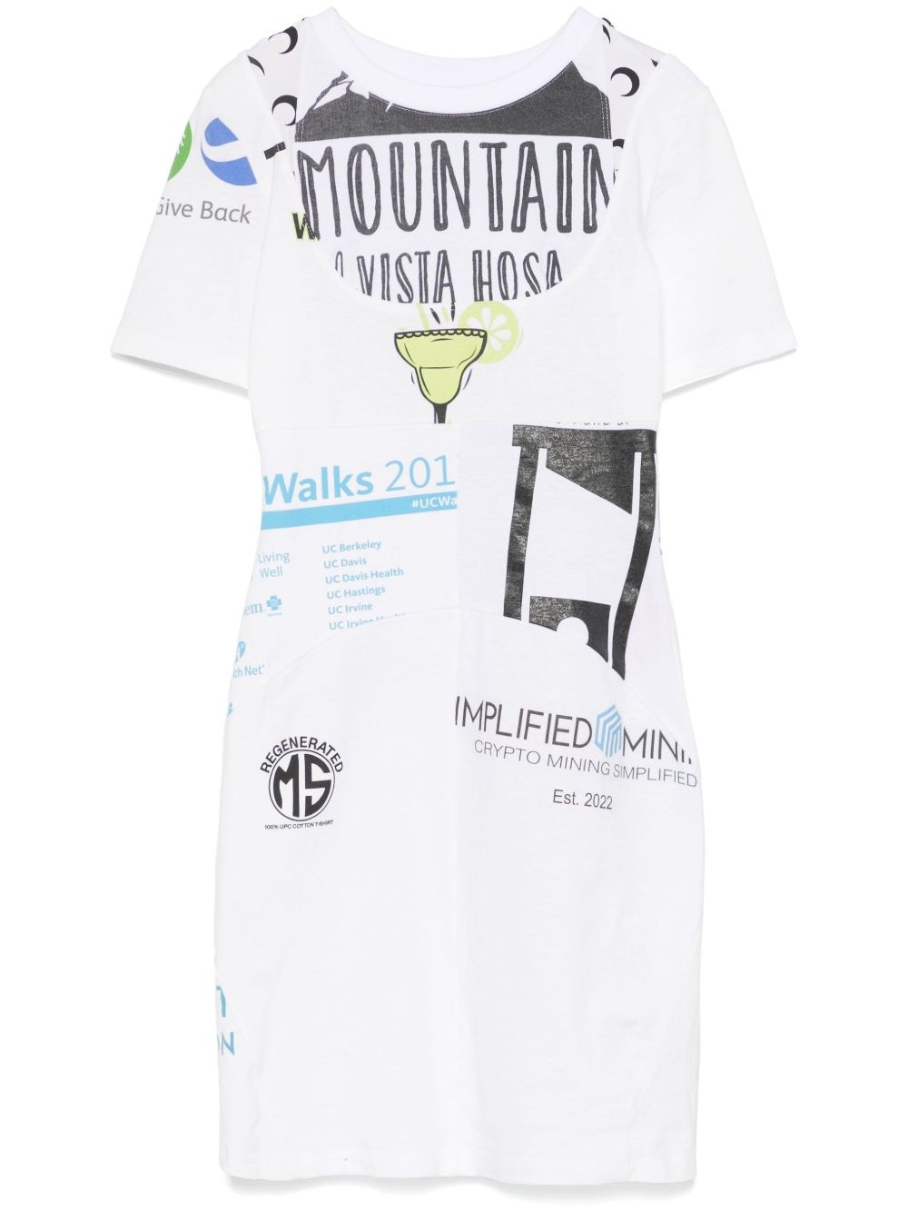 graphic T-shirt mini dress Highlights - White - Crew neck - Short sleeves - Patchwork design - This product is crafted from upcycled materials so the one you receive may differ slightly from the item pictured. Imported Composition Cotton 100%, Recycled Polyamide 88%, Recycled Elastane 12% SIZE & FIT Model measurements Height 5 ft 11 in(1.8 m) Bust/Chest 32.67 in(83 cm) Hips 36.22 in(92 cm) Waist 24.4 in(62 cm) FittingInformation Designed for a close fit throughout Made from a midweight non-stretch fabric, this piece offers minimal elasticity when worn