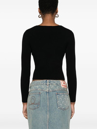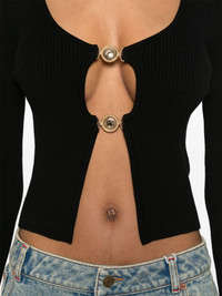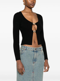 knit cardigan Highlights - Black - Front buckle fastening - Cut-out detailing - Logo-embossed buttons - Plunging u-neck Imported Composition Viscose 70%, Elastane 30% SIZE & FIT Model measurements Height 5 ft 11 in(1.8 m) Bust/Chest 31.49 in(80 cm) Hips 36.61 in(93 cm) Waist 24.4 in(62 cm) FittingInformation Designed for a close fit throughout Made with a midweight knit, this piece offers some stretch