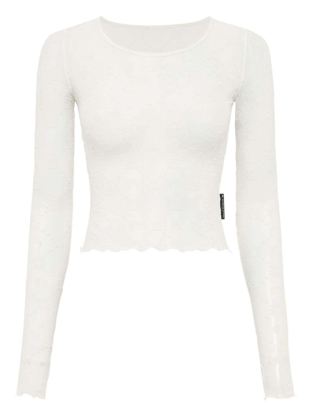 mesh cropped top Highlights - White - Round neck - Long sleeves - Semi-sheer construction - Lettuce hem Made in France Composition Recycled Polyamide 86%, Elastane 14% SIZE & FIT FittingInformation Designed for a close fit throughout The sleeves are constructed with additional length and built-in thumb loops that allow for movement and a secure fit Made from a lightweight stretch fabric, this piece offers elasticity and flexibility when worn