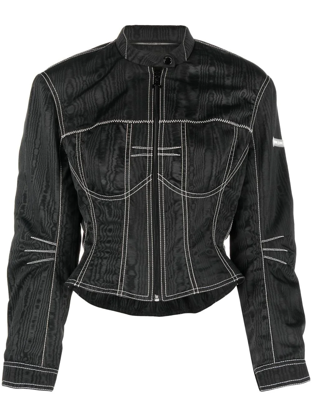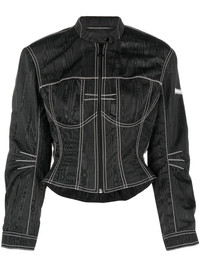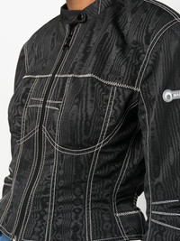 moire-effect fitted jacket A contemporary take on the racing jacket, this Marine Serre piece cinches at the waist for a more elegant fit, a silhouette that is accentuated by the contrast stitching that delineates its curves. It is crafted in the brand's signature moire effect. Highlights - Black - Recycled polyester blend - Moire effect - Contrast stitching - High neck - Front zip fastening - Long sleeves Imported Composition Recycled Polyester 62%, Polyester 38% SIZE & FIT Model measurements Height 5 ft 11 in(1.8 m) Bust/Chest 31.49 in(80 cm) Hips 35.82 in(91 cm) Waist 24.8 in(63 cm) Washing instructions Dry Clean Only