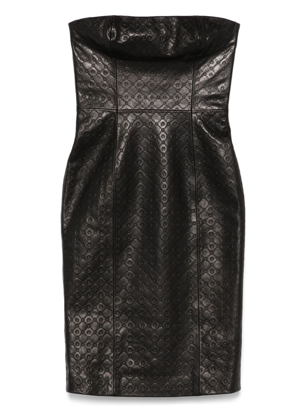 monogram-embossed leather mini dress Highlights - Black - Concealed rear hook and zip fastening - Strapless - Rear slit - Logo-jacquard lining Made in Italy Composition Outer: Sheepskin 100% Lining: Viscose 100% SIZE & FIT Model measurements Height 5 ft 10 in(1.77 m) Bust/Chest 32.28 in(82 cm) Hips 35.03 in(89 cm) Waist 25.19 in(64 cm) FittingInformation Designed for a close fit throughout The vented hem offers movement at the rear Soft leather has a supple and smooth construction offering some flexibility