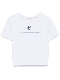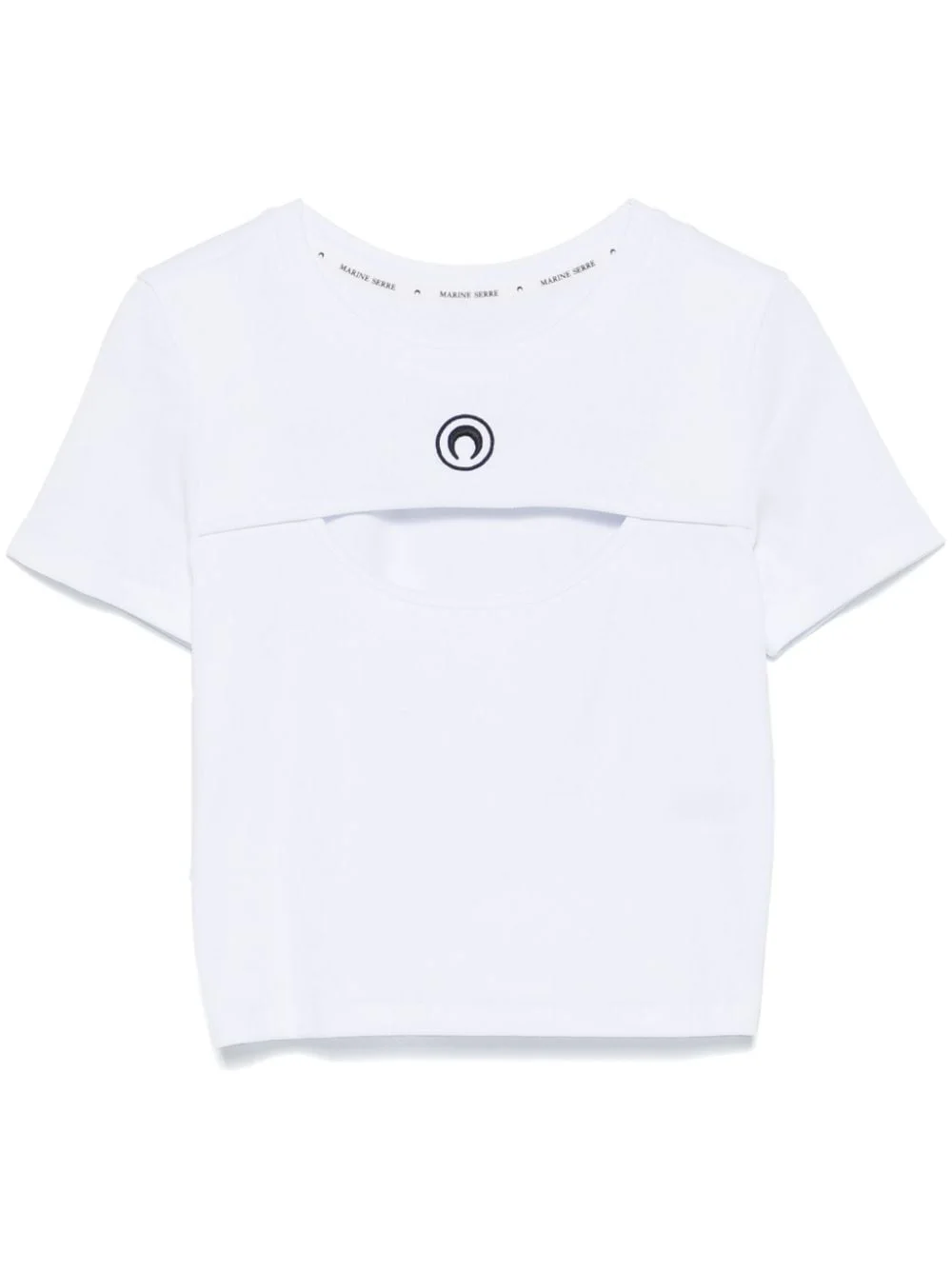 moon-logo cut-out T-shirt Highlights - White - Organic cotton blend - Fine ribbed - Embroidered moon logo to the front - Cut-out detailing - Crew neck - Short sleeves - Straight hem - Cropped Imported Composition Organic Cotton 95%, Elastane 5% SIZE & FIT Model measurements Height 5 ft 11 in(1.8 m) Bust/Chest 33.07 in(84 cm) Hips 37.4 in(95 cm) Waist 25.19 in(64 cm) Measurement SLEEVE LENGTH 5.51 in(14 cm) LENGTH 14.56 in(37 cm) BUST 27.55 in(70 cm) Shoulder Width 12.2 in(31 cm) FittingInformation Designed for a slim fit that sits just away from the body offering a close yet comfortable fit Cropped in length Made from a midweight stretch fabric, this piece offers elasticity and flexibility when worn Washing instructions Machine Wash