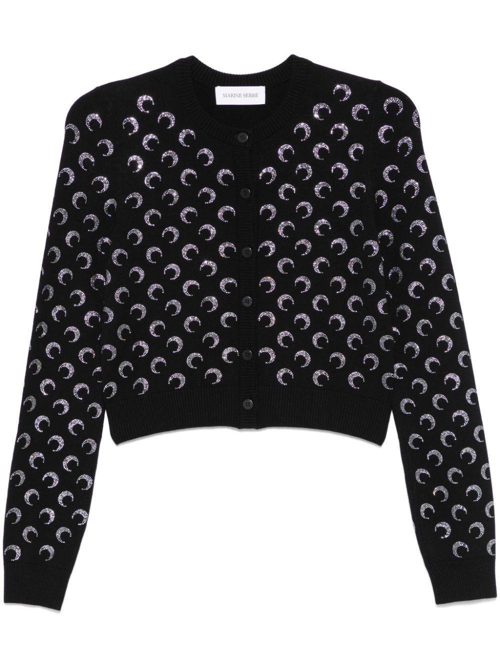 Moon rhinestoned cardigan Highlights - Black - Fine knit - Signature crescent moon motif - Rhinestone embellishment - Front button fastening - Crew neck - Long sleeves - Ribbed cuffs and hem - Cropped Imported Composition Viscose 98%, Elastane 2%