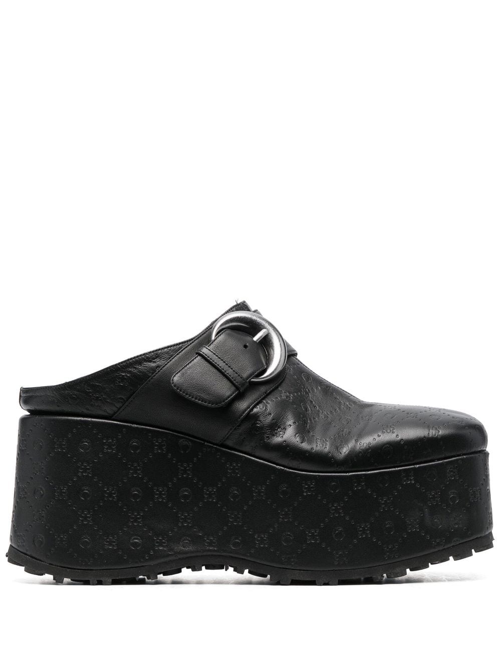 Moonogram 86mm heel leather clogs black calf leather/lambskin debossed monogram pattern decorative buckle detail square toe slip-on style 86mm heel branded insole platform sole Imported Composition Lining: Calf Leather 100% Outer: Lambskin 100% Sole: Rubber 100% SIZE & FIT Measurement HEEL 3.38 in(8.6 cm) PLATFORM 2.36 in(6 cm)