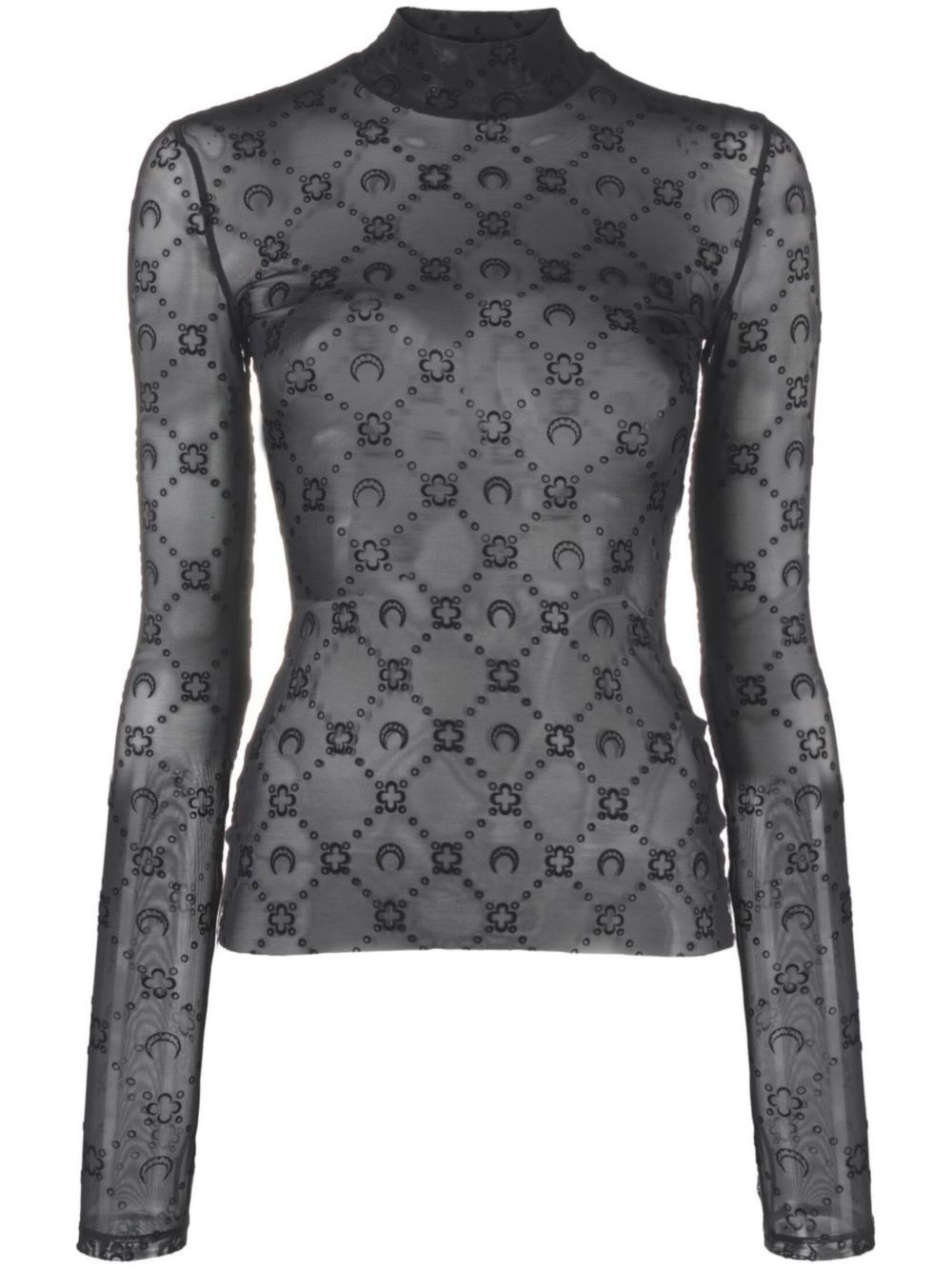 Moonogram-flocked mesh top Highlights - Black - Recycled polyamide blend - Mesh design - Sheer - All-over flocked moonogram - High neck - Long sleeves - Straight hem Made in France Composition Recycled Polyamide 86%, Elastane 14% SIZE & FIT FittingInformation Designed for a close fit throughout Made from a lightweight stretch fabric, this piece offers elasticity and flexibility when worn Measurement SLEEVE LENGTH 25.98 in(66 cm) LENGTH 22.51 in(57.2 cm) WAIST 22 in(55.9 cm) BUST 27.99 in(71.1 cm)