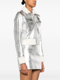 Moonogram-pattern laminated leather jacket A futuristic undertone characterises Marine Serre's aesthetic, evidenced by this jacket. Made from laminated silver-tone lambskin, it evokes a modern look, recalling space-age-era fashion. It is adorned with the brand's debossed Moonogram pattern along the sleeves and rear, whilst white ribbed-knit trim adds textural and visual contrast. Highlights - Silver-tone - Lambskin - Laminated finish - Debossed monogram pattern - Branded zip puller - Contrasting trim - Ribbed trim - High neck - Front zip fastening - Long sleeves - Two chest flap pockets - Straight hem Made in Italy Composition Body: Lamb Skin 100% Lining: Viscose 100% SIZE & FIT Model measurements Height 5 ft 10 in(1.77 m) Bust/Chest 33.07 in(84 cm) Hips 37 in(94 cm) Waist 24.8 in(63 cm) FittingInformation Designed for a relaxed fit, this piece allows for comfort and movement when worn The ribbed hem offers a close, comfortable fit Made from a midweight non-stretch fabric This piece fits true to size – take your usual size Washing instructions Dry Clean Only