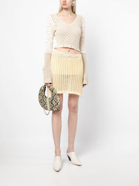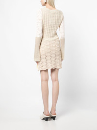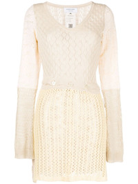 patchwork crochet minidress A mix of upcycled pieces is behind the construction of this regenerated minidress by Marine Serre. Specifically, this dress was created out of crochet jumpers, cardigans and knit pieces from the brand's factory, resulting in this one-of-a-kind garment. Its crocheted fabric, patchwork construction and light, neutral colouring impart a neutral, raw quality. Aside from its uniqueness, this dress is also versatile, as the buttons around the waist allow for it to be separated and worn as two different pieces. Highlights - Light yellow/white/ecru - Cotton - Patchwork design - Crochet panelling - Contrasting panel detail - V-neck - Button fastening - Long sleeves - Asymmetric hem - Two separate pieces Made in Italy Composition Cotton 100% SIZE & FIT Model measurements Height 5 ft 10 in(1.77 m) Bust/Chest 31.88 in(81 cm) Hips 33.85 in(86 cm) Waist 24.01 in(61 cm) Washing instructions Hand Wash