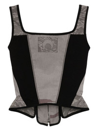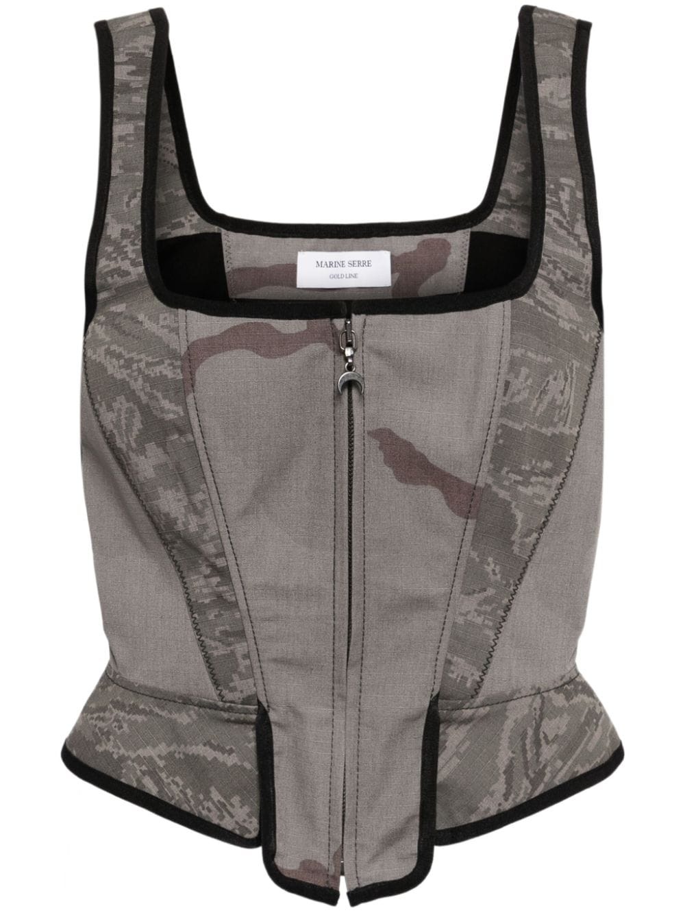 Regenerated cotton corset top An unexpected combination of silhouette and pattern, this grey Marine Serre top is spliced from worsted and ripstop fabrics to a corset silhouette and patterned with two types of camo prints. The peplum hem stays true to its roots while stretch-jersey panels allow for freedom of movement. Highlights - Medium grey, brown - Corset style - Ripstop panels - Stretch-jersey panels - Panelled design - Camouflage print - Piped-trim detailing - Sleeveless - Square neck - Peplum hem - Logo patch to the rear - Partial lining - Front zip fastening Imported Composition Outer: Polyester 65%, Cotton 33%, Viscose 2% Lining: Cotton 100% Washing instructions Dry Clean Only