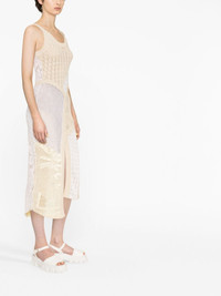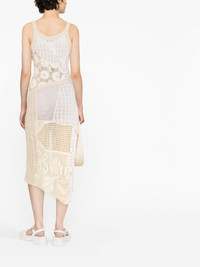 Regenerated crochet midi dress In line with Marine Serre’s eco-conscious aesthetic, this midi dress is upcycled from a variety of crochet pieces. The result is a unique asymmetric patchwork construction. Highlights - Light beige - Cotton - Crochet knit - Patchwork design - Scoop neck - Off-centre front button fastening - Sleeveless - Asymmetric hem Made in Italy Composition Cotton 100% SIZE & FIT Model measurements Height 5 ft 10 in(1.78 m) Bust/Chest 30.7 in(78 cm) Hips 34.64 in(88 cm) Waist 23.22 in(59 cm) FittingInformation Designed for a slim fit that sits just away from the body offering a close yet comfortable fit Made with a midweight knit, this piece offers some stretch This piece fits true to size – take your usual size Washing instructions Hand Wash