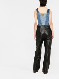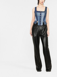 regenerated denim bustier top Crafted from regenerated denim in a panelled design, this bustier top showcases Marine Serre's sustainable ethos. Highlights - Blue - Front button fastening - Panelled design - Square neck - Sleeveless Made in France Composition Cotton 98%, Elastane 2% SIZE & FIT Model measurements Height 5 ft 11 in(1.8 m) Bust/Chest 31.49 in(80 cm) Hips 35.43 in(90 cm) Waist 25.19 in(64 cm) Measurement LENGTH 18.5 in(47 cm) WAIST 24.01 in(61 cm) BUST 29.01 in(73.7 cm) Washing instructions Dry Clean Only