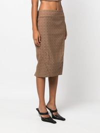 Regenerated Moon Diamant jacquard midi skirt First seen in 2023, Marine Serre's Moon Diamant motif showcases the brand's crescent moon logo framed by a diamond shape. Here it appears in a jacquard pattern defining this midi skirt. Highlights - Light brown - Recycled polyester blend - Jacquard logo motif - Mid-rise - Two front welt pockets - Logo patch to the rear - Rear slit - Knee-length - Straight hem Imported Composition Outer: Recycled Polyester 55%, Wool 43%, Elastane 2% Lining: Viscose 100% SIZE & FIT Model measurements Height 5 ft 10 in(1.77 m) Bust/Chest 31.88 in(81 cm) Hips 36.22 in(92 cm) Waist 24.01 in(61 cm) FittingInformation This midi-length skirt is intended to be worn just below the waist Made from a midweight non-stretch fabric This piece fits true to size – take your usual size Washing instructions Dry Clean Only