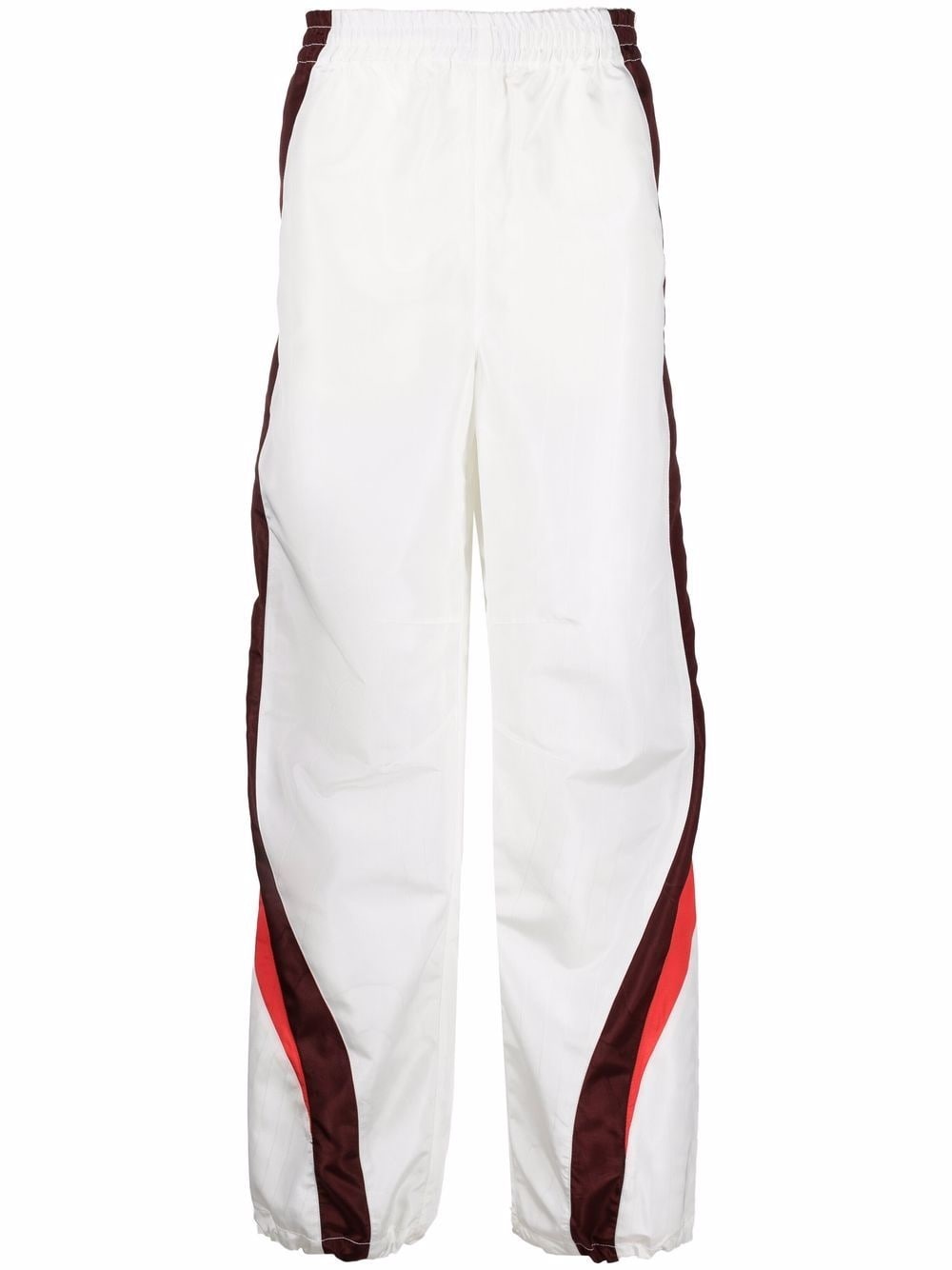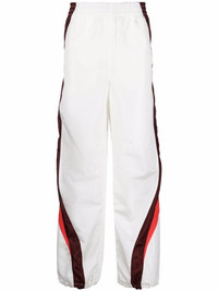 side-stripe track pants Marine Serre's trousers offer a street-style-inspired silhouette. Contrasting stripes trim the relaxed leg for a bold finish. Highlights - White/red/burgundy - Recycled polyester - Side stripe detailing - Elasticated waistband - Straight leg - Two side slit pockets Imported Composition Outer: Recycled Polyester 100% Lining: Viscose 58%, Cupro 42% SIZE & FIT Model measurements Height 5 ft 10 in(1.78 m) Bust/Chest 31.49 in(80 cm) Hips 36.22 in(92 cm) Waist 25.59 in(65 cm) FittingInformation This piece fits true to size. We recommend you get your regular size Designed for a slim fit at the waist and loose over the leg Made with a mid-weight non-stretch fabric Washing instructions Dry Clean Only