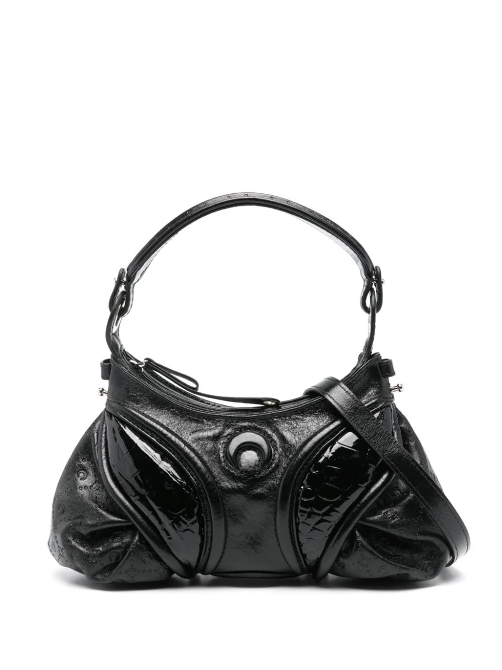small Futura shoulder bag Highlights - Black - Calf leather - Crinkled finish - Embossed crocodile-effect panels - Crescent moon embossed to the front - Signature moonogram pattern panels - Panelled design - Internal logo patch - Silver-tone hardware - Top zip fastening - Single detachable top handle - Detachable shoulder strap - Main compartment - Logo-jacquard lining - This piece comes complete with a protective dust bag. Imported Composition Lining: Polyester 100% Outer: Calf Leather 100% SIZE & FIT Model measurements Height 5 ft 9 in(1.75 m) Bust/Chest 34.64 in(88 cm) Hips 36.61 in(93 cm) Waist 26.37 in(67 cm) Measurement DEPTH 3.14 in(8 cm) HANDLE 4.72 in(12 cm) HEIGHT 5.11 in(13 cm) STRAP 20.07 in(51 cm) WIDTH 10.62 in(27 cm)